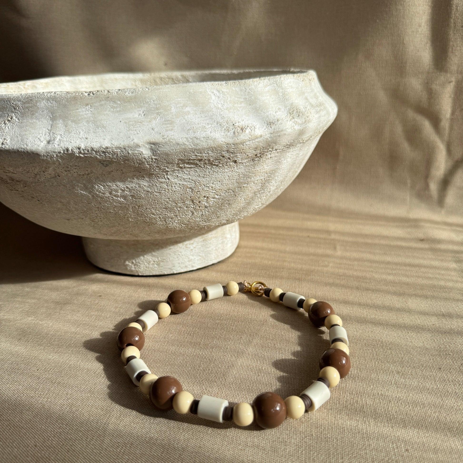 De anti-Tekenketting Mokka combineert een elegante, aardse uitstraling met natuurlijke bescherming. Handgemaakt uit acrylkralen, EM-kralen en polymeerklei ringetjes – zorgvuldig gekozen voor hun harmonieuze kleuren en lichte draagcomfort.