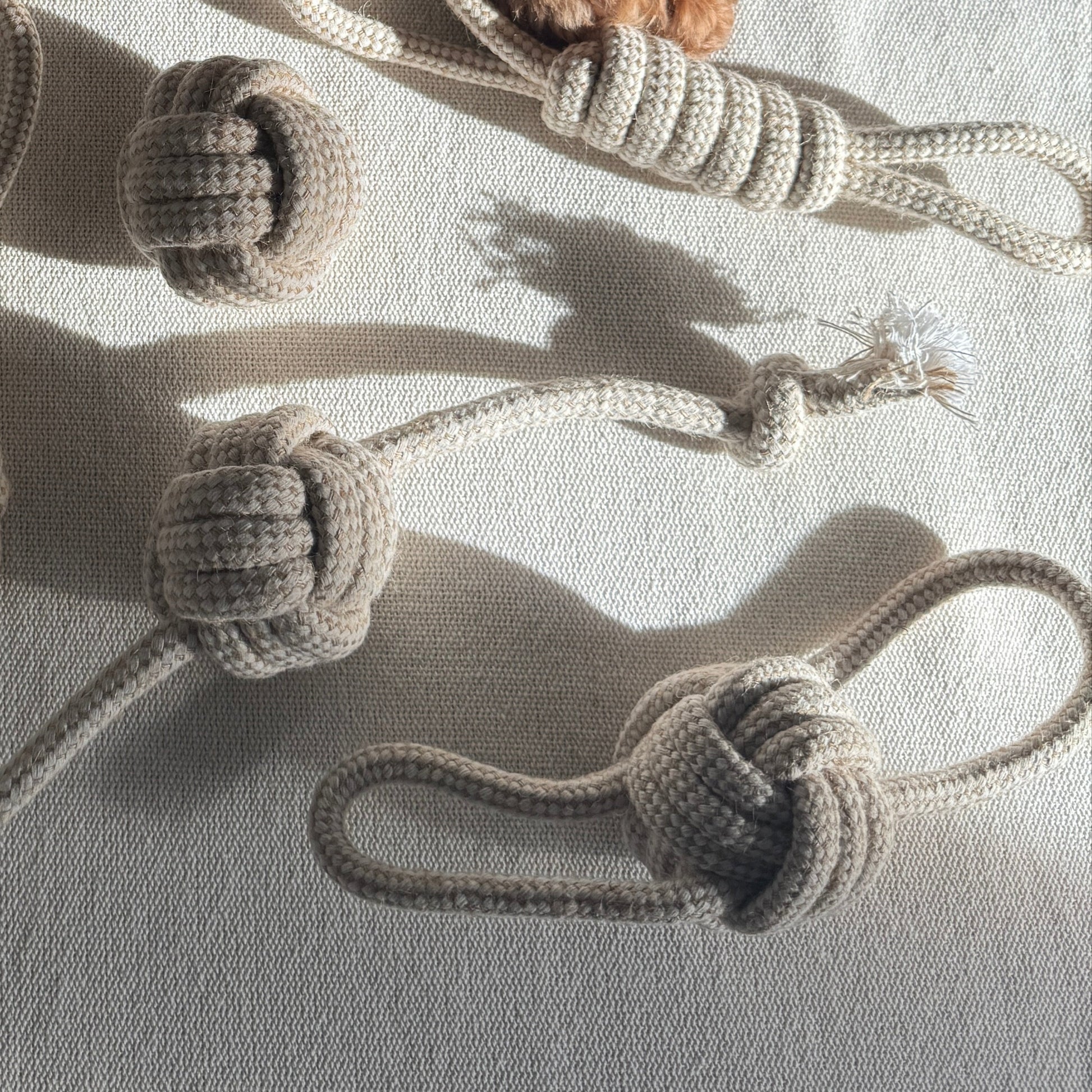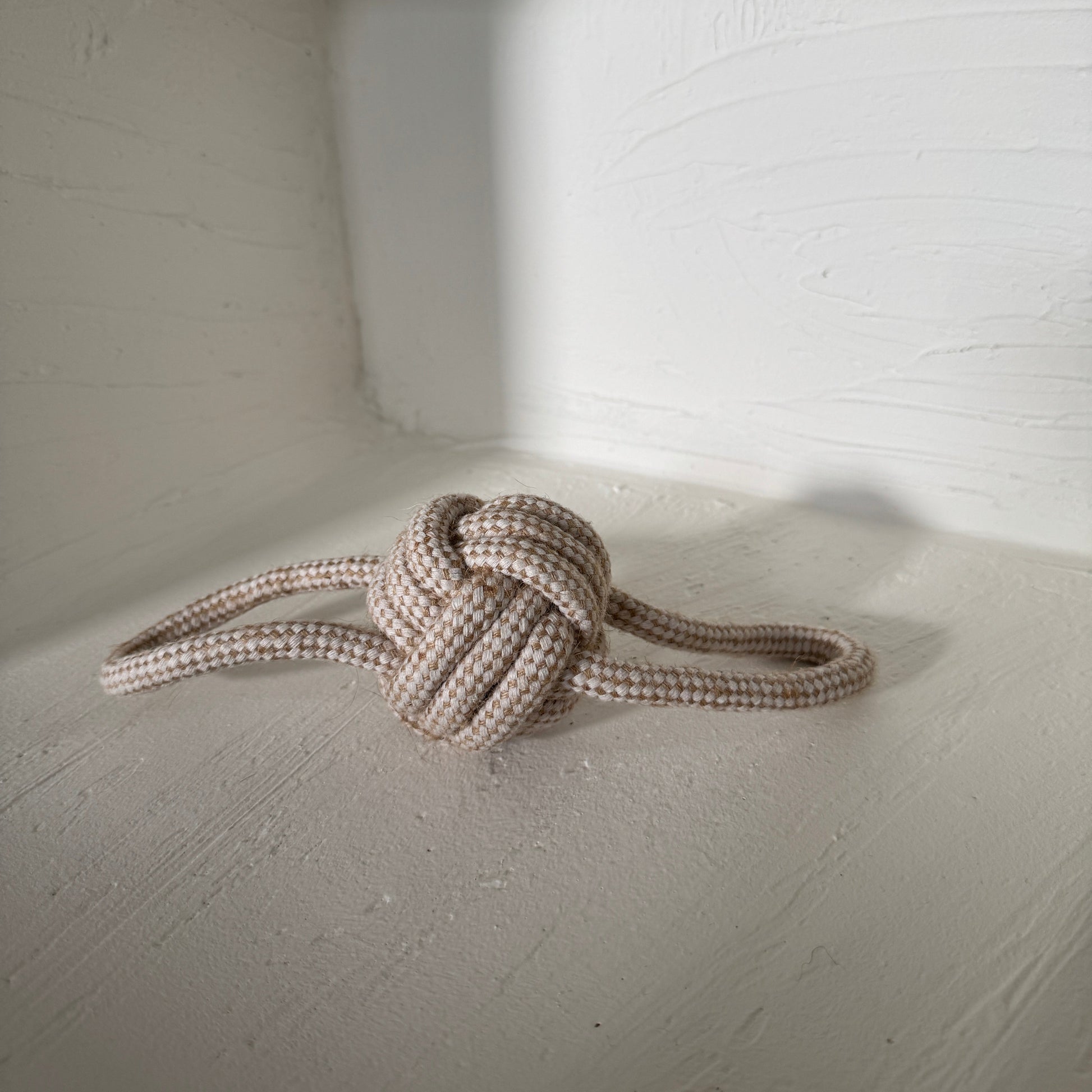 Dit hondenspeeltje gemaakt van natuurlijke materialen met aan twee kanten een touwlus en een bal in het midden is perfect voor bijt- en trekspelletjes. Het is gemaakt van duurzaam jute en sterk katoen.